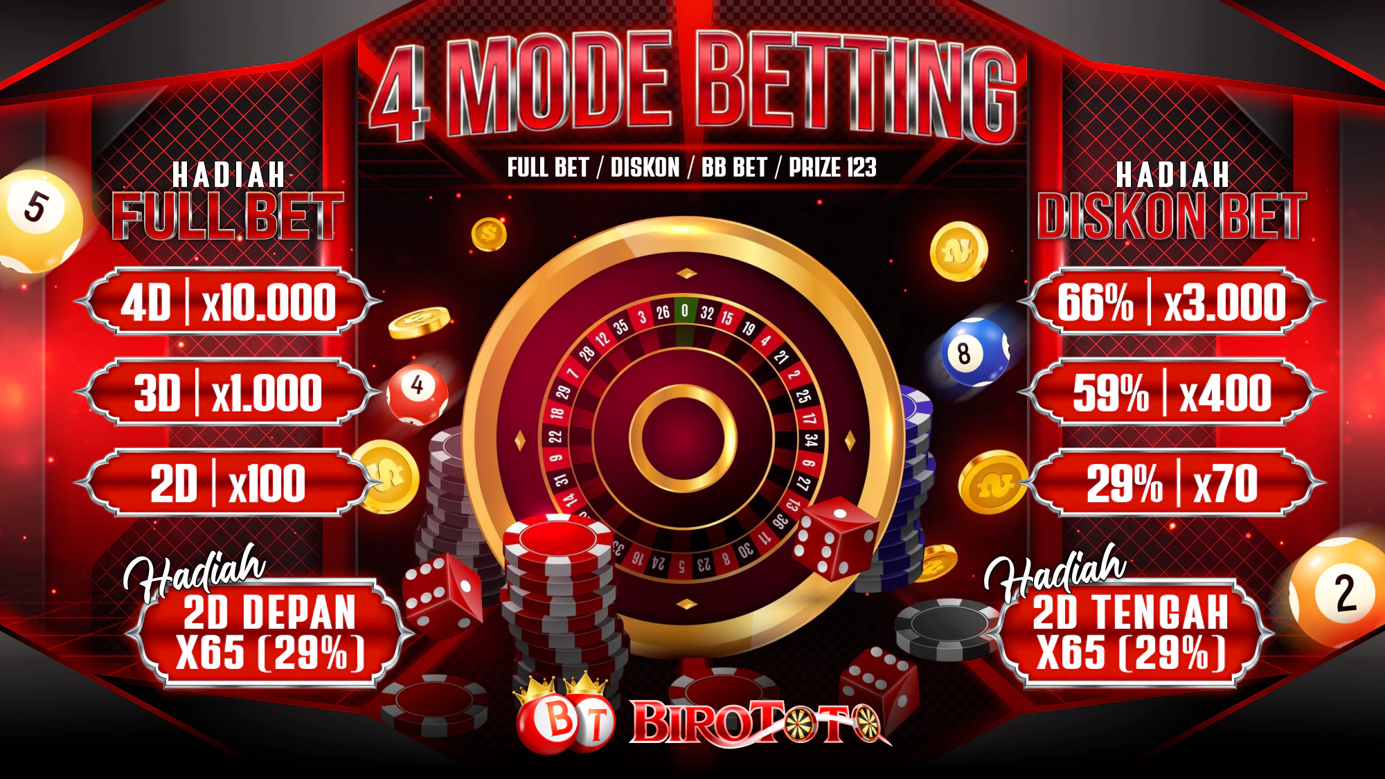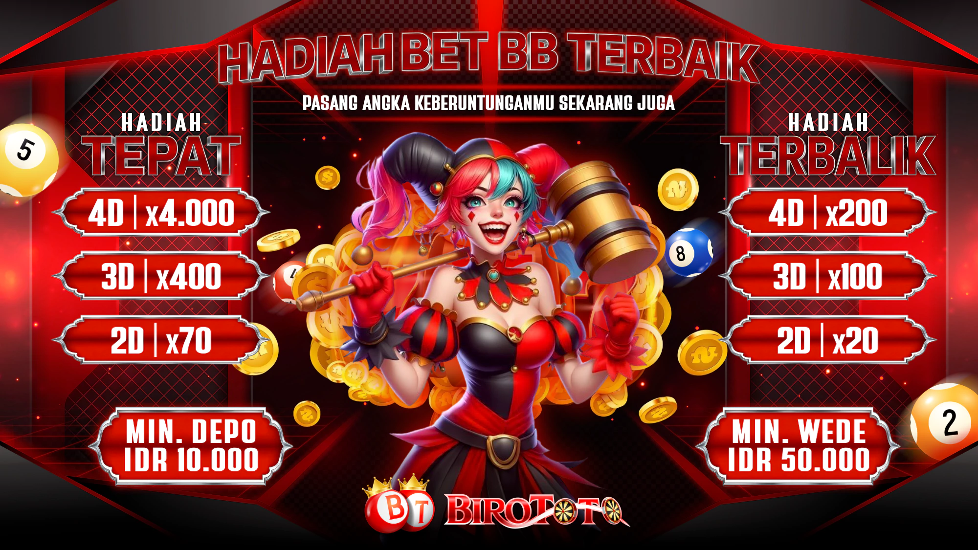 SELAMAT DATANG DI BIROTOTO Bandar Togel Oline Terbesar Dan terpercaya di Indonesia, Rasakan kenyamanan dan Proses Deposit tercepat dengan bergabung bersama kami. mainkan Togel Online dengan minimal bettingan hanya 100 perak saja dan dengan minimal deposit 10.000 dengan 1 akun id bisa bermain di semua permainan Judi Online